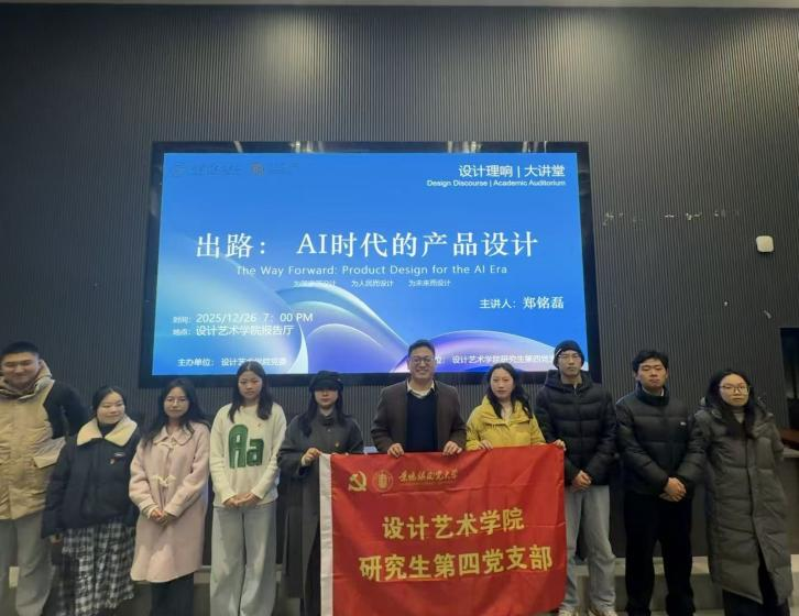为深化“设计红”党建品牌建设,设计艺术学院坚持党建引领,创新推进“理论学习+设计前沿”“主题党日+学术讲座”融合学习模式,积极引导师生从党的创新理论中汲取力量,深刻把握“把论文写在祖国大地上”的实践要求,主动对接国家重大需求,在乡村振兴、城市更新、文化创新中坚定自信、找准定位,把设计融入国计民生,在祖国大地的烟火气中书写“以人民为中心”的设计答卷。12月26日,设计艺术学院研究生第四党支部承办的“设计理响大讲堂”在设院一楼学术报告厅开讲,校发展规划处副处长郑铭磊副教授受邀作题为“出路:AI时代的产品设计”的讲座。支部全体党员、入党积极分子及产品设计专业学生共计200余人参加。