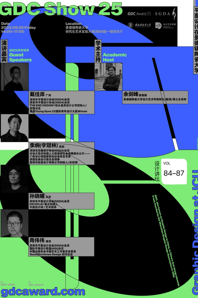 2025年9月26日下午,GDC Show 2025系列活动在景德镇陶瓷大学举行。GDC设计奖(Graphic Design in China)是由深圳市平面设计协会(SGDA)于1992年创办,前身为平面设计在中国展,是中国首个面向全球的大型综合性设计竞赛双年展活动。经过三十余年的发展,GDC设计奖已经成为中国最具行业影响力和专业权威性的顶级设计赛事。活动由景德镇陶瓷大学设计艺术学院院长余剑峰教授担任学术主持。