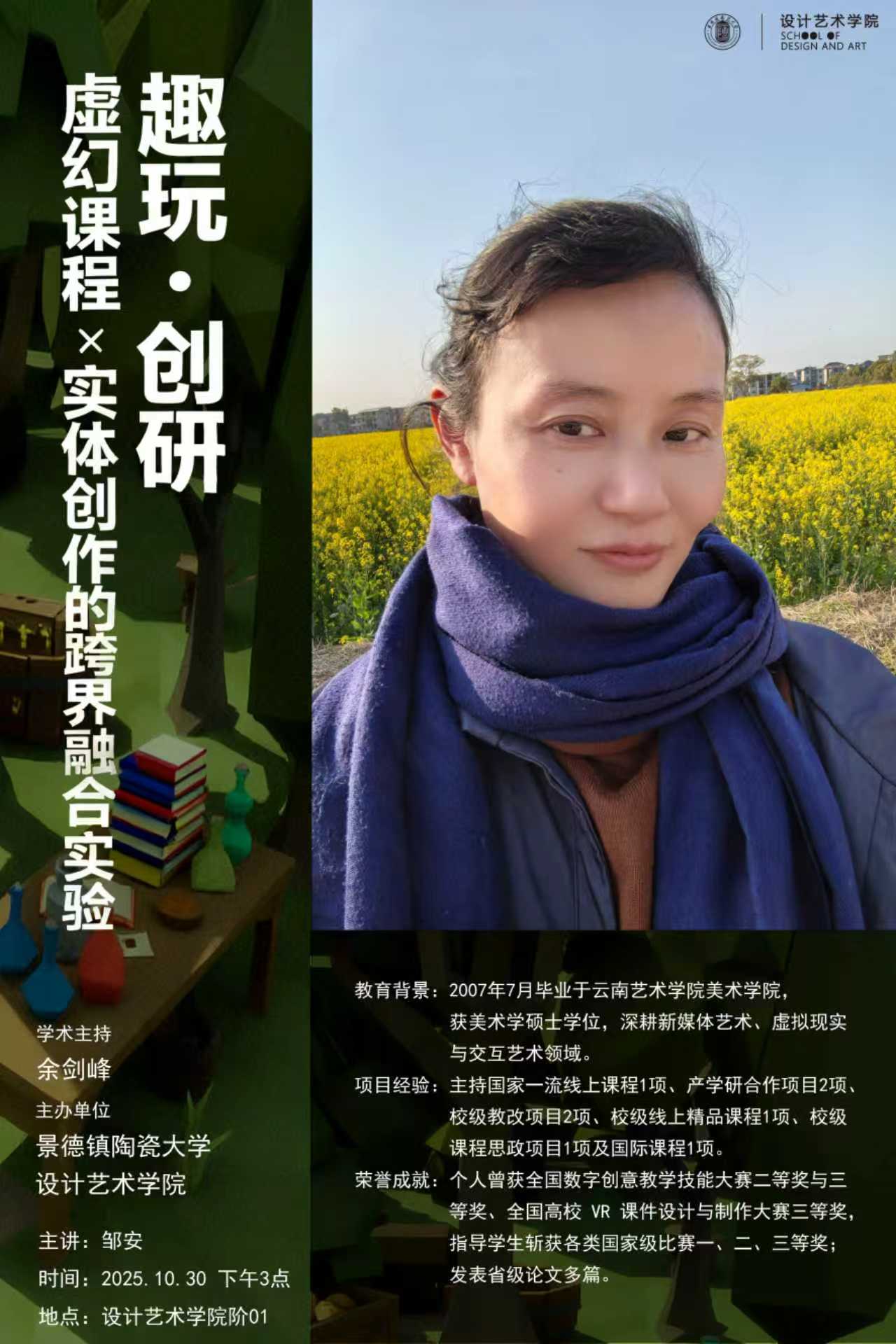 2025年10月30日下午,一场聚焦“虚幻课程×实体创作”的跨界融合讲座在现场观众的热烈掌声中圆满落幕。景德镇陶瓷大学设计艺术学院数字媒体艺术专业讲师邹安老师,以《趣玩・创研 —— 虚幻课程 × 实体创作的跨界融合实验》为题,用120分钟的精彩分享,带领在场师生探索数字技术与实体创作碰撞的无限可能,为创意教育与实践创新注入新灵感。