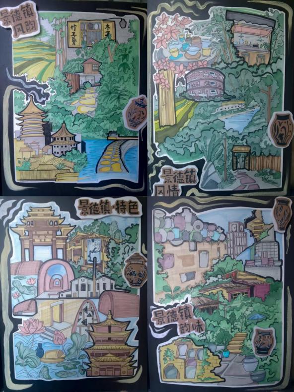 在马克思主义学院举办的2024年“画说思政”竞赛中,她以《感受景德镇之韵味,秀景德镇大好河山》为题创作参赛作品,巧妙融合景德镇的窑火元素与动人革命故事。历经多轮精心打磨与反复修改,该作品最终荣获校级一等奖。这次经历不仅是对其专业能力的肯定,更让她明确了“以设计传递红色文化”的创作方向。她希望通过作品传递正向价值,让设计承载思想,让美育涵养心灵。
