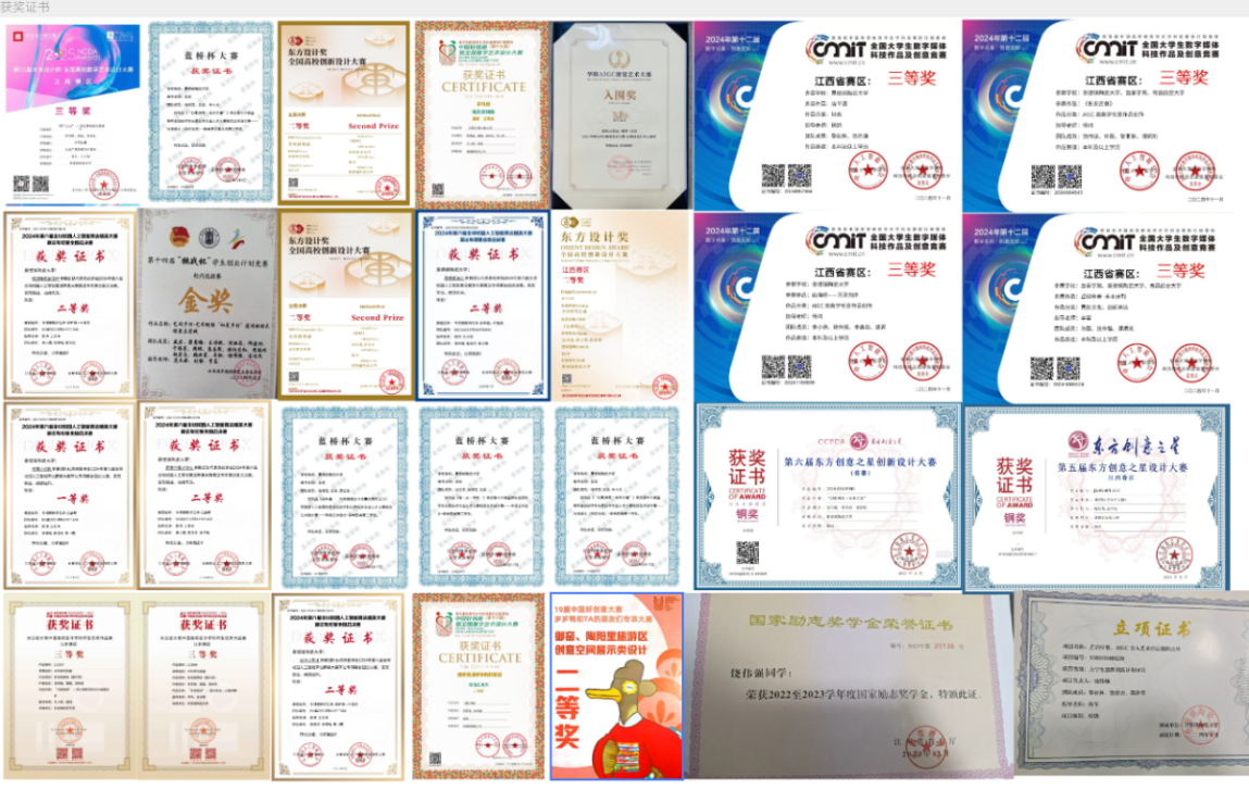 设计之路,既是艺术的追寻,也是思维与毅力的磨砺。饶伟强深知,优秀的设计绝非偶然,而是源于反复推敲与持续优化。2024年10月至2025年1月,他带领团队参加“全国人工算法精英大赛”,围绕“山海经与科技融合”主题,结合AI设计理念与社会情感表达进行创作。面对创作瓶颈与时间压力,他沉着组织团队研讨、精心打磨,在色彩、构图、结构等方面不断调整完善。每一次推翻与重构,都是技艺与认知的升华。历经方案构思、素材收集、视觉建模与成品呈现等多个阶段,最终该系列作品凭借独特的艺术视角与精湛的技术表现,荣获国家级一等奖1项、国家级二等奖3项。