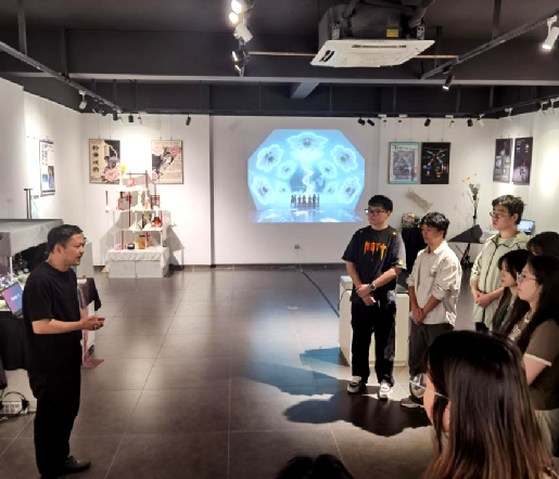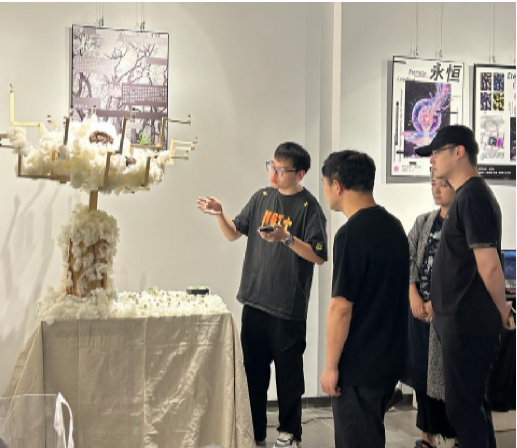 展览期间,设计艺术学院院长余剑峰、系主任袁冶莅临现场参观并听取学生讲解。每组同学均围绕自身创作的主题、理念与技术实现进行了深入阐述,展现出公共艺术专业学生扎实的理论基础与强烈的实验精神。参观结束后,余剑峰院长对本次展览给予了高度评价。随后,指导教师吕思训对本次展览进行了总结点评。