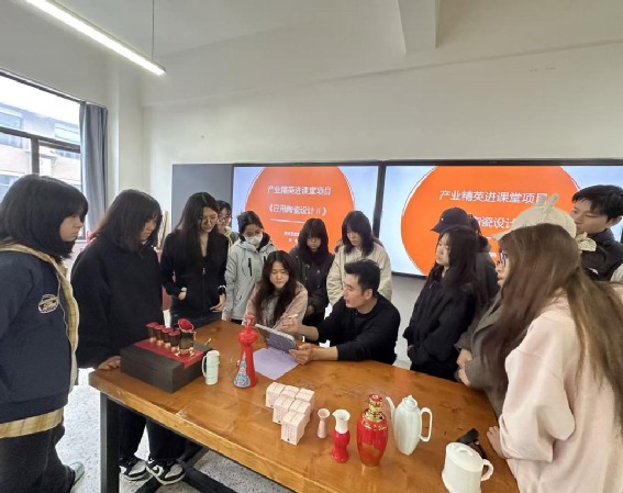 课堂上,翟文晓凭借数十年行业积淀,从四个层面进行系统讲授:一是战国青铜餐具的文化解析,二是传统饮酒场景的审美意蕴,三是酒器设计的实战策略——结合经典案例,深入剖析器型比例把控、釉色质感选择与纹饰文化提炼等关键技法,四是校企合作项目复盘,以2022级毕业设计为样本,完整梳理从设计推进、样品打样到实物呈现的全流程实践。
